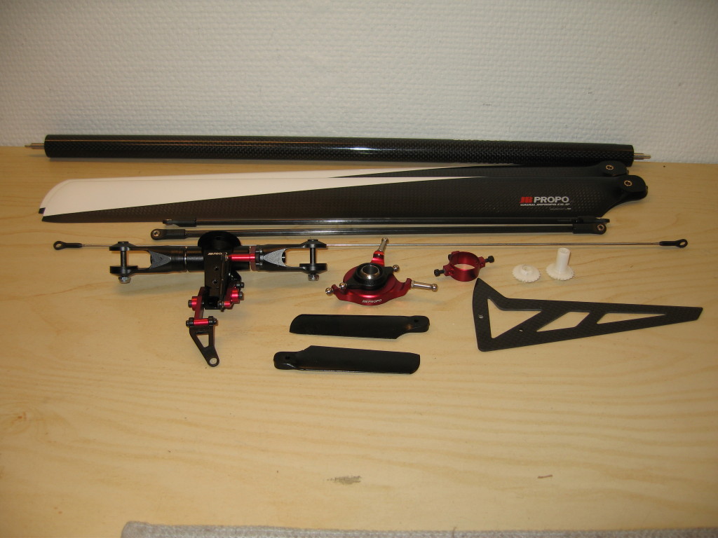For de som kun skal bygge om til E6-550 kommer selvsagt hovedblader i tillegg under må ha listen. Men siden jeg skal ha et 3-bladers hode på denne så er hovedblader ikke listet opp. Hele oppgraderingen koster noen hundrelapper hos Elefun. Hvor mange hundrelapper kommer an på hvor mange bør og kan oppgraderinger man koster på seg. Men et standard E6-550 kit inneholder alle de delene som her er listet opp.