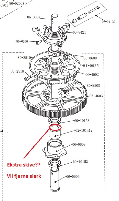 Oppdaget også at hoveddrevet har en slark 1-2mm opp og ned på main shaft. er dette normalt. Kanskje derfor den bråker litt ekstra?