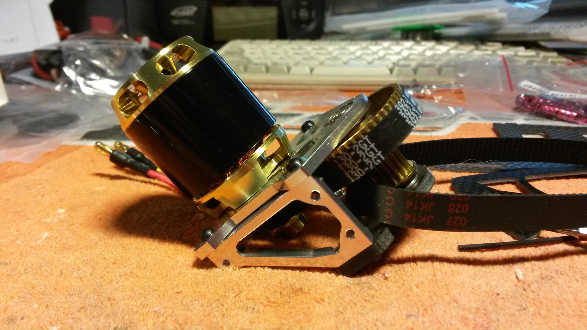 Første steget er å bygge motorbukken. Det er litt mer knot med belter enn med en pinjong som går rett mot drev, men man slipper masse styr med å meshe riktig.