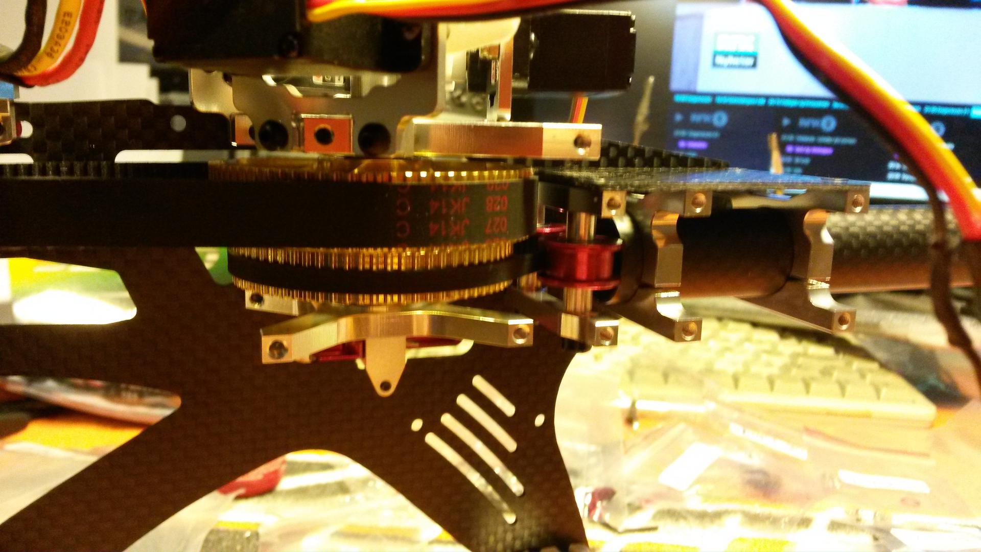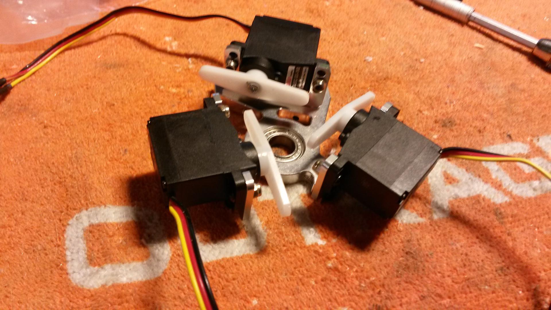 Neste steg er å montere servoer til cyclic på øvre bearing block. Her må jeg tilpasse servohorn og sentere litt bedre samt sette på swash baller, men tar dette når alt er montert.