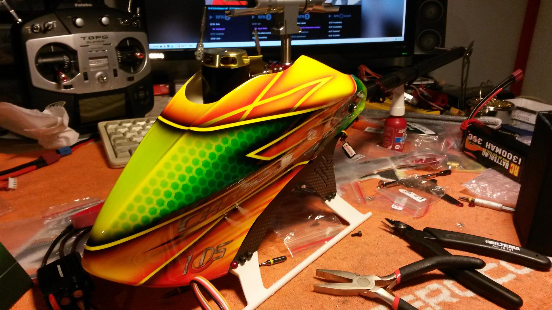 Nesten ferdig. Fra jeg åpnet esken til jeg kom til dette skrittet var det gått ca 2 timer (!) Dette er et lettbygget heli! Litt forsmådd over at jeg må av med motor og rute kabler framover, mangler 5mm med kablene gående ut fra der den går nå. Kjipt, for det innebærer at jeg må av med belter osv også.