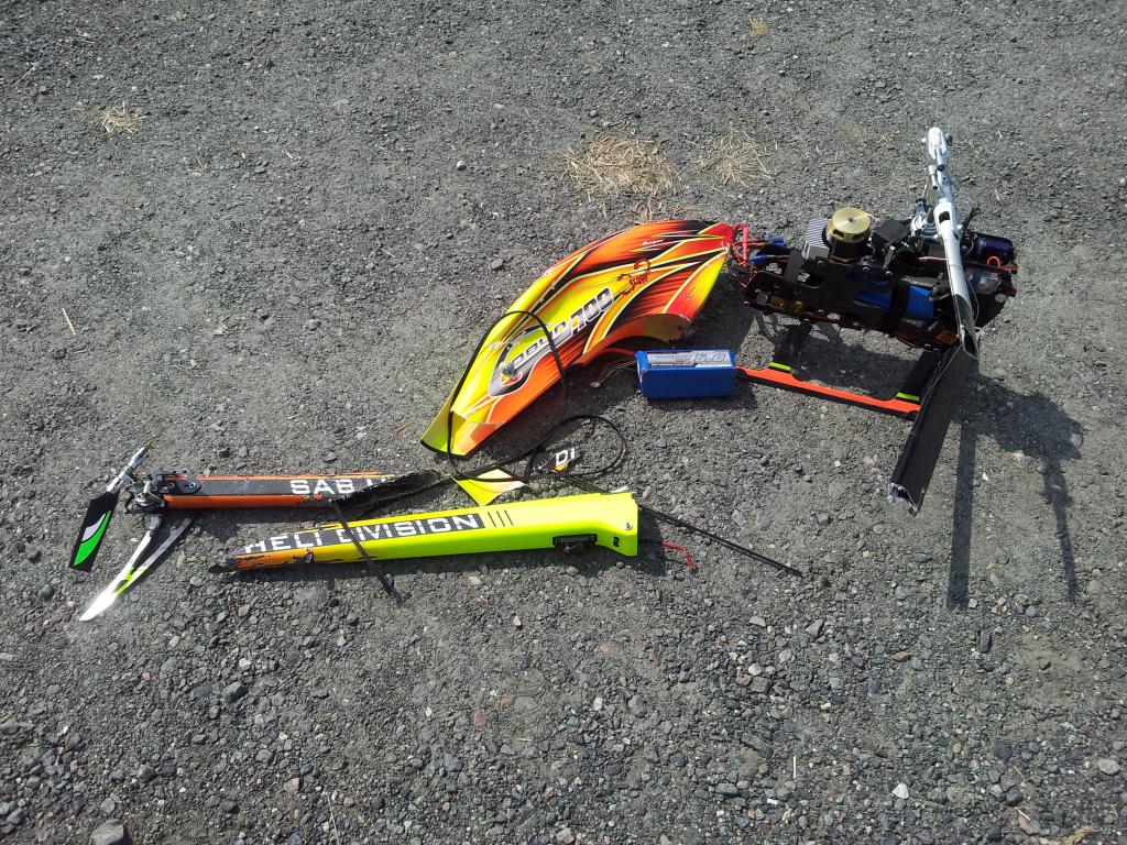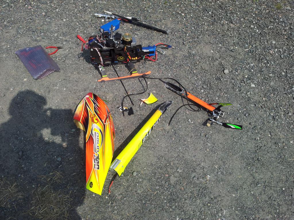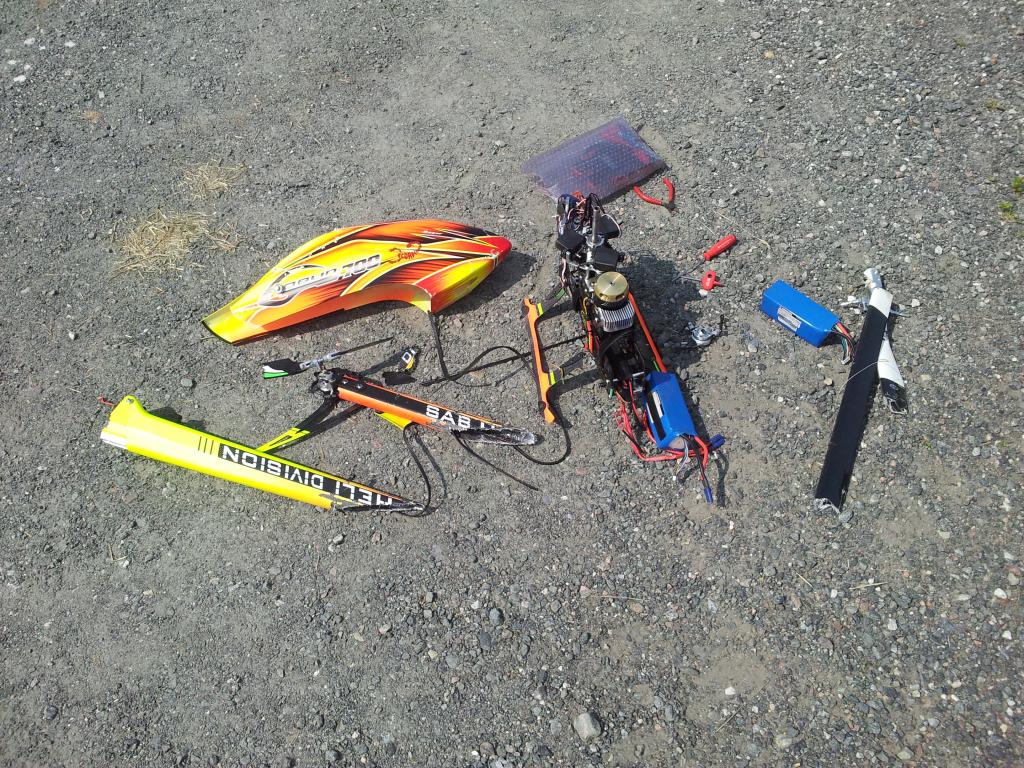 Smalt sikkli godt da den traff grusen! 2 servoer, main shaft, feathering shaft, canopy, blader, dfc links og litt te..