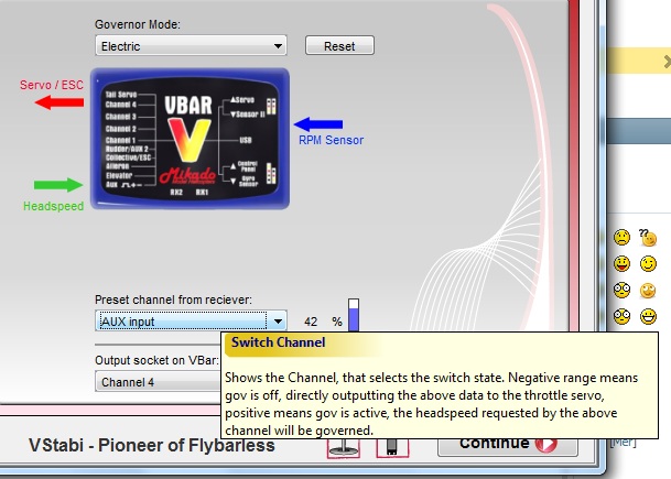 Slik jeg forstår det så skal "Hyperion Phase sensor" loddes på en motorledning og kobles i "Sensor II" porten på V-bar enheten, det er i og for seg OK og allerede gjort. Så skal ESC'en i en ledig kanal, enten "Servo" eller "kanal 4" som er ledig hos meg (Står i CH4 nå). Det også er i og for seg OK. Problemet er "preset channel from receiver" står på "AUX" og den bruker jeg for å sette Gain på halen fra radioen.. Står litt fast her