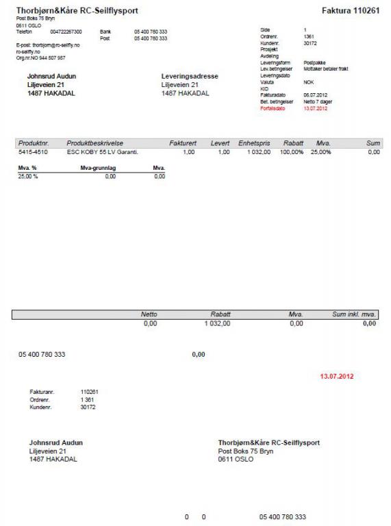 Vedlagte bilder viser esc kun tatt ut av pakken en gang for å se at alt er ok, samt fakturaen fra Thorbjørn og Kåre som kvitering på denne.
