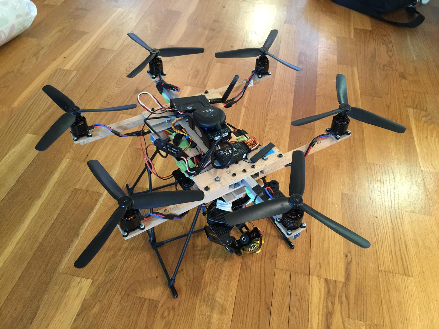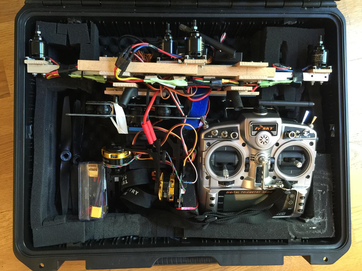 Det er sammenleggbart, har 3-aksers gimbal til Nex/RX100 og får plass i klassisk Clas Ohlson-koffert. Ikke bare det, men du får plass til radio, batterier, verktøy, bakkestasjon og propeller også. Alt i en koffert. Selges med kofferten og FrSky Taranis radio med X8R mottaker.