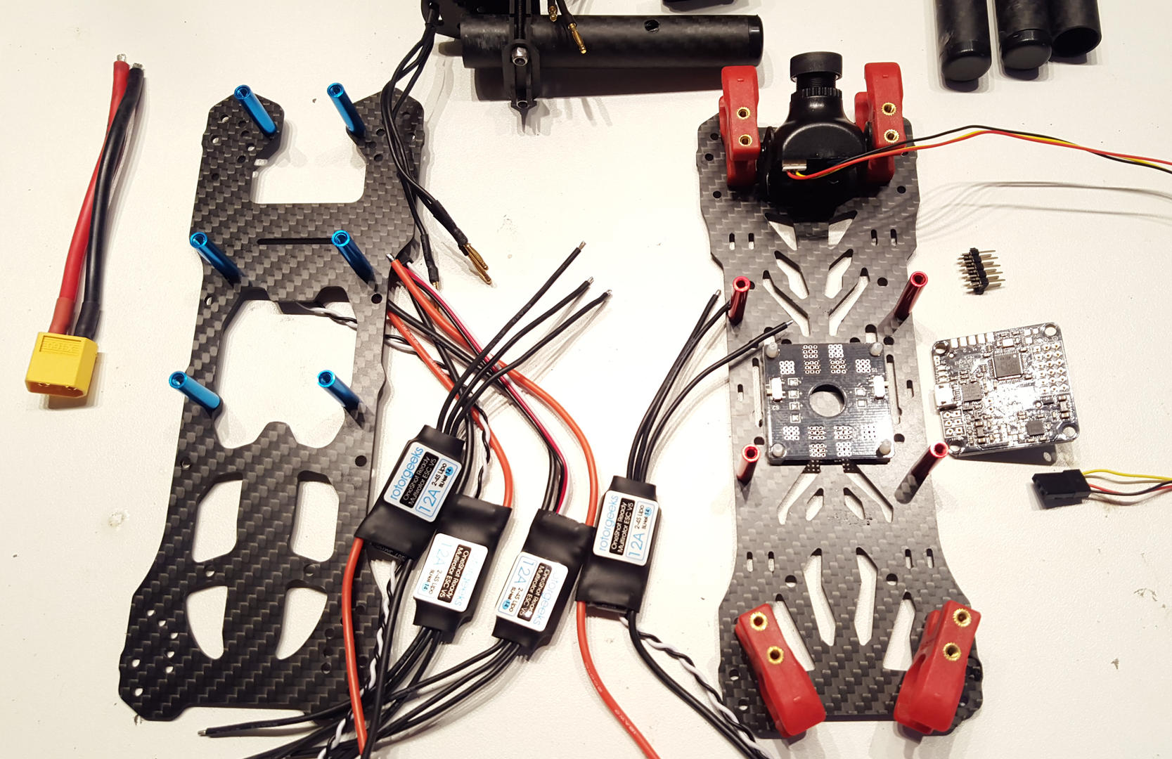 Når så motorer var montert på armene og ramma var det bare å lodde på ESC'ene og få loddet alt sammen mot PDB.