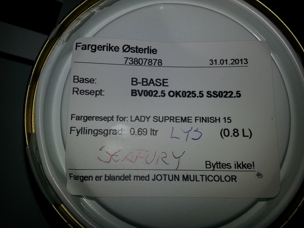 Har du malingsboksen ennå Hans Petter? Da slipper Håvard å scanne om fargen din ble ok. Den er vel angitt på etiketten?