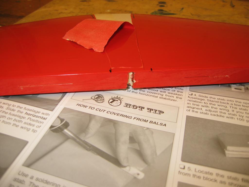 Trekket er Monokote og det trengtes en runde med strykejernet over hele flyet. Litt skrukker og slapp betrekning, særlig på rorene. Ingen av rorene er hengslet men det er klargjort med slisser i rorene og vingen. CA-hengsler til rorene og pinnehengsler på flapsen.