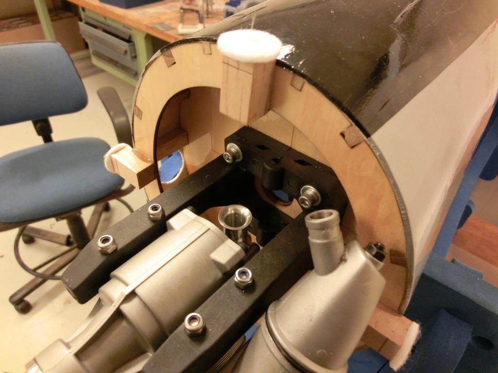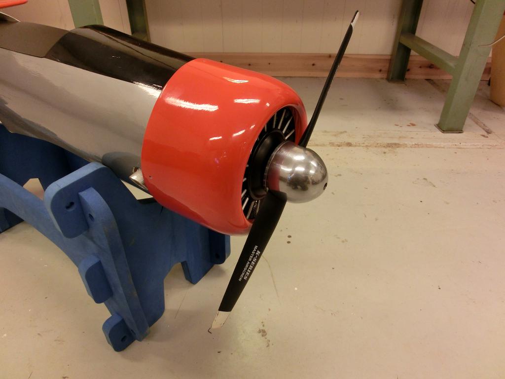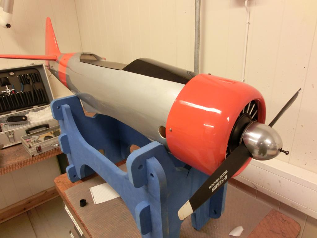 Ca tre måneder etter oppstart og forrige innlegg i denne tråden så da kan det vel trengs en oppdatering. Vingen er ferdig, med servoer og understell montert. Haleflater er på plass og servoer i kroppen er montert. Throttleservo må monteres litt anderledes da staget til gasseren kommer litt høyt i forhold til plasseringen av servoen. Cowling er ferdig tilpasset. Det er et veldig "rettfram" sett å montere, alt passer veldig greit. Eksos er under fabrikkering og er forhåpentlig på plass i neste uke. Da kan jeg og finne ut hvor flyet balanserer slik at batteriet kan plasseres mest mulig gunstig. Neste innsatsområde etter det blir cockpit og canopymontering. Intet fancy planlagt, men jeg prøver å få det til slik at det ikke blir sittende et par tvillinger i cockpiten.