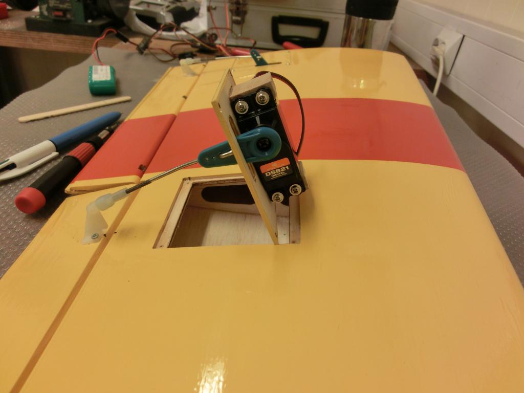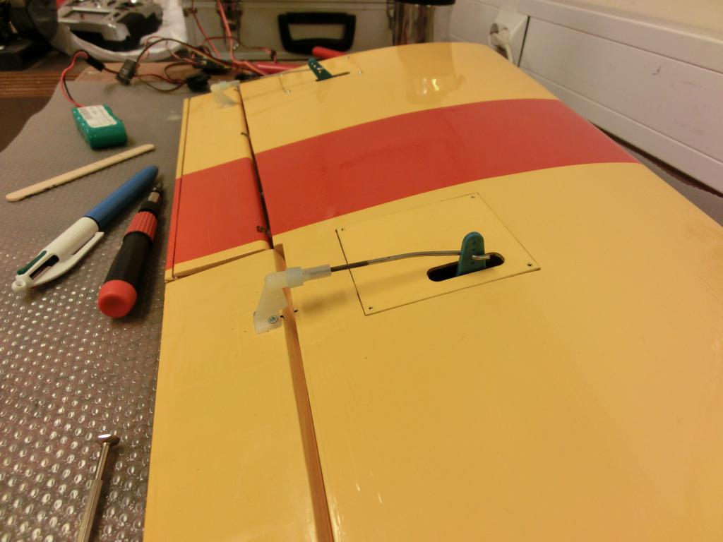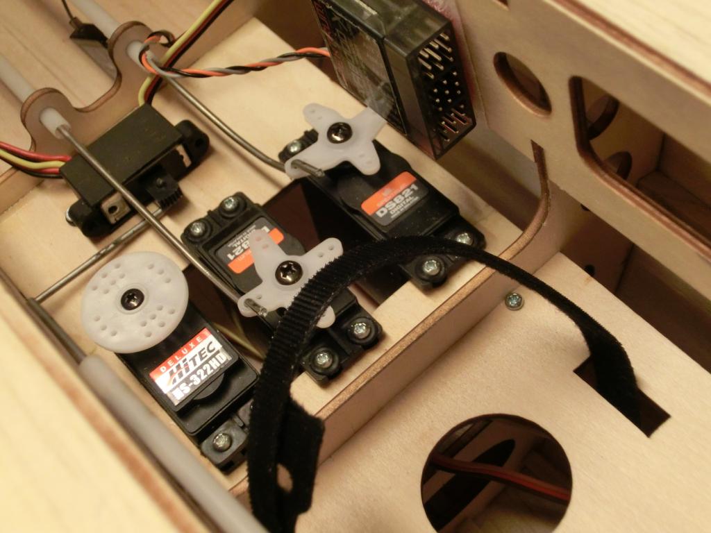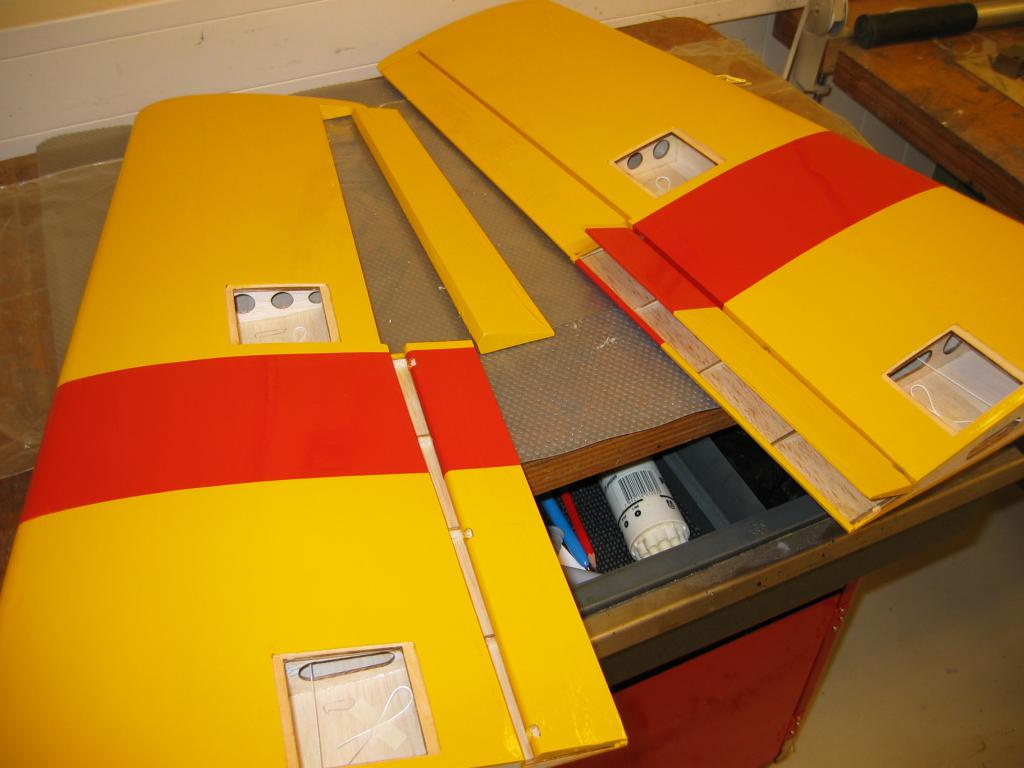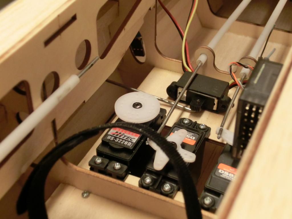 Jeg begynner med vingen. Den er tredelt, med senterseksjon og høyre/ venstre vingeseksjoner. Ytterseksjonene har balanseror og flaps, senterseksjon har retracts og flaps. Flapsen er litt spesielt oppbygd, med en servo i hver ytterseksjon og stålpinner som kobler sammen alle tre seksjonene, Retracts er standard mekaniske og de følger med i settet. Retractservor blir Hitec HS-75. På alle ror bruker jeg Spektrum 821 servoer og til throttle en Hitec HS-322.