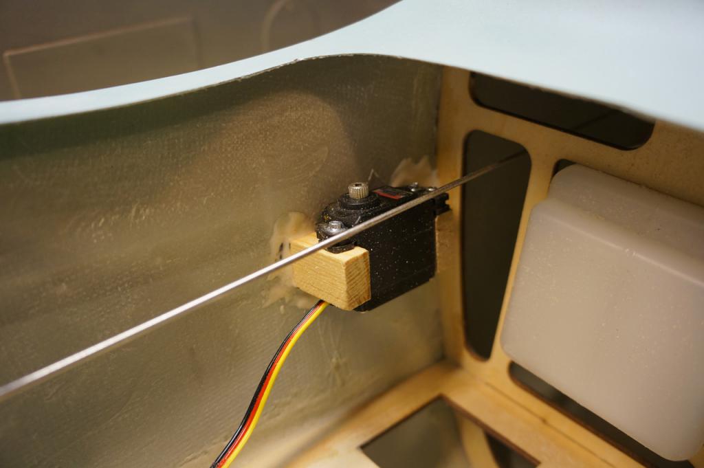 Finner frem en 2 mm stang med gjenger i den ene siden og borer så hull i firewall og tilpasser så lengden på staget. På throttleservoen bruker jeg bare en Z-bøyer tank og ikke noe mulighet for justering, mens jeg i den andre enden bruker kulelink slik at det ikke blir noe spenn i staget. Den tilpasningen jeg vanligvis gjør er halv gass på stikka og omtrentlig halv gass på forgasseren. Resten justerer jeg med endepunkter og etter hvert throttlekurve slik at gasskurven blir så jevn som mulig. Tenningsanlegget plasserer jeg på trespantet som ligger i forkant av servoene og bruker dobbeltsidig tape samt stripser den som sikring. Plugghette og ledning til pickupsensoren føres ut gjennom to hull i kroppen foran som jeg setter inn gummiforinger i så ikke ledningen ligger å gnisser som igjen garantert vil skape problemer senere.____________________________
