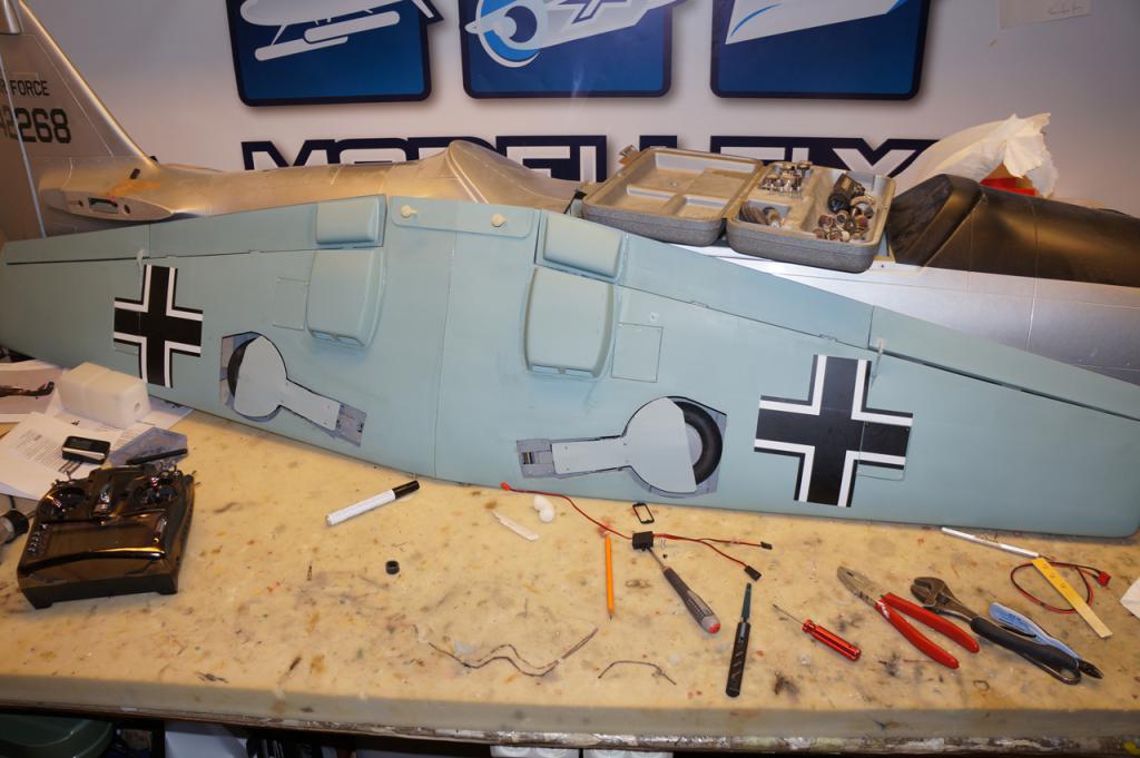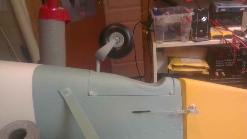 Navet er ganske tykt så måtte også på Maxbo å kjøpe 6x45 mm bolter som ble kuttet ned 2-3 mm slik at de fungerte som hjulaksel. I tillegg måtte jeg slipe ned unbrakohodet litt slik at hjulene gikk langt nok inn. Jeg malte også understellsleggene og retract slik at det blir penest mulig. Etter litt finjustering av vinkler etc så ble dette rimelig bra. Flate hjulluker i treverk på buet underside ser ikke spesielt bra ut. Bruker 0,8mm aluminium fra Bauhaus som skjæres ut og slipes pent før den bøyes forsiktig og tilpasses. Trefestene som følger med ESM er beregnet for å lime fast i understellet og jeg synes ikke løsningen er spesielt god så bestilte ett par cnc freste utgaver fra Shindin som lager custom understell. Derfor blir det sikkert maiden før lukene er på plass.