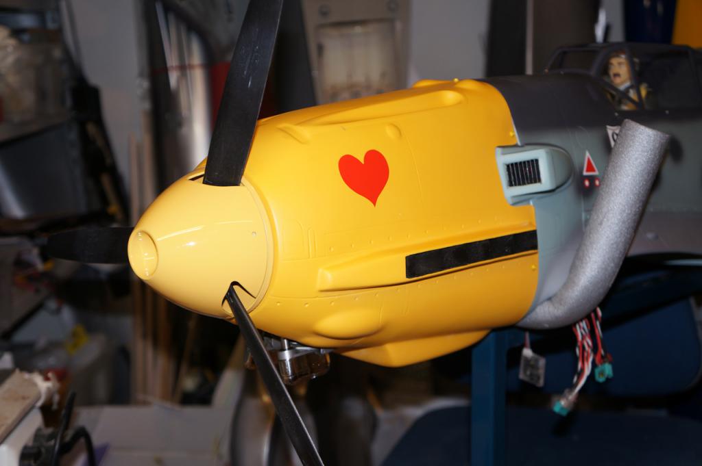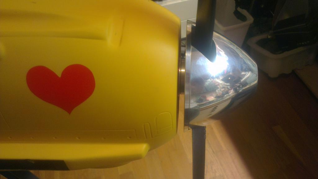 Ellers dukket jo neste problem opp, spinneren. Den går innover i front, dvs ekstremt lite klaring mellon innvendig i tupp av spinner og propellaksel. Det er ett problem ESM vet om og anbefaler derfor 4mm tykk skive bak spinner. Den har ikke jeg tatt høyde for og det er uaktuelt å gjøre noe med det nå. Også uaktuelt å ha 4 mm klaring mellom spinner og cowling. Selv med en nedkuttet mutter i front med hull til festeskrue så lar det seg ikke gjøre å få festet spinneren.