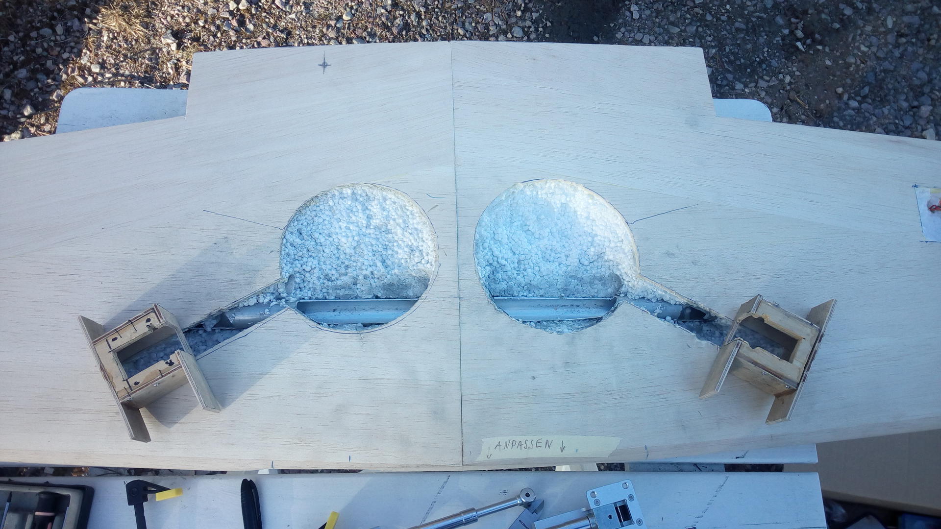 Har tenkt å prøve å lime inn de festen i riktig vinkel i vingen slik att de blir vinklet fremover. tror de tar opp støt fra takeoff og landing bedre da en om jeg limer de rett inn og vinkler understellet med å skimse mellom når jeg skrur det fast.