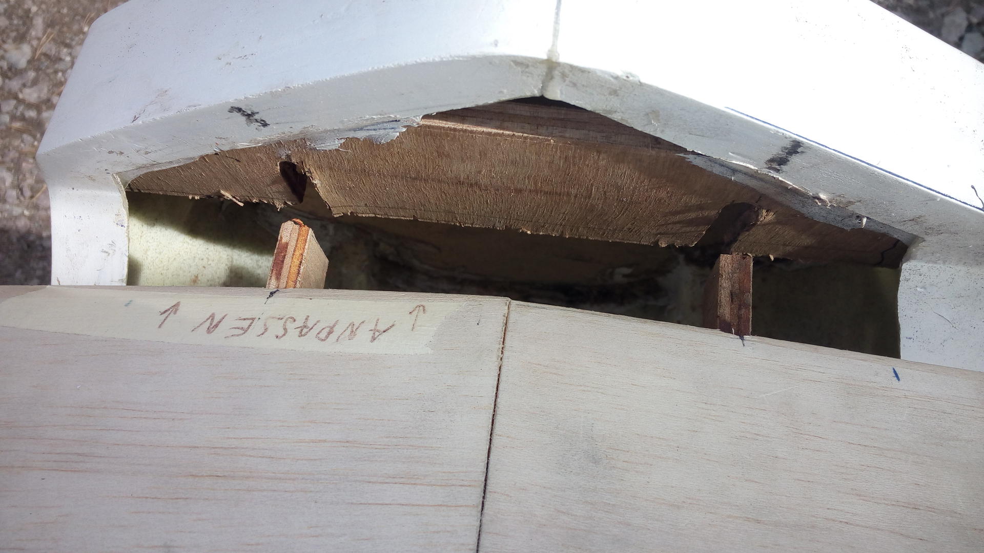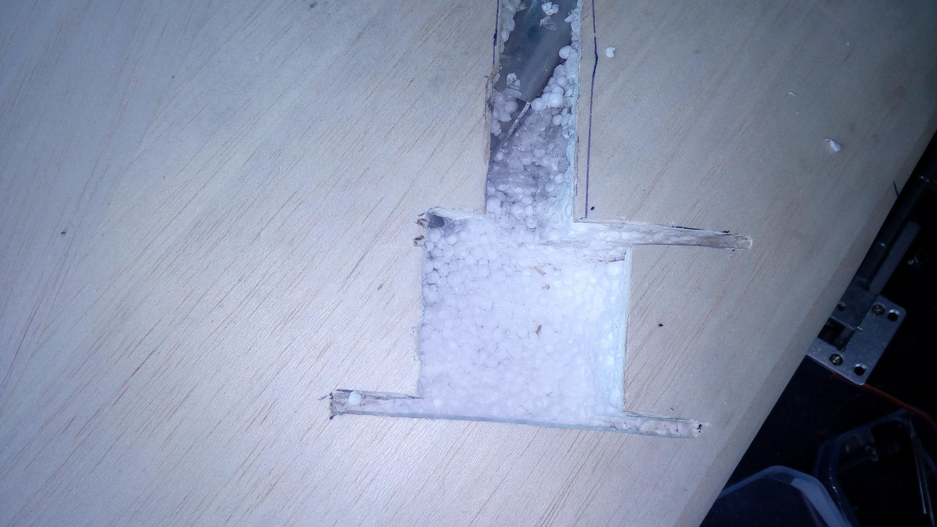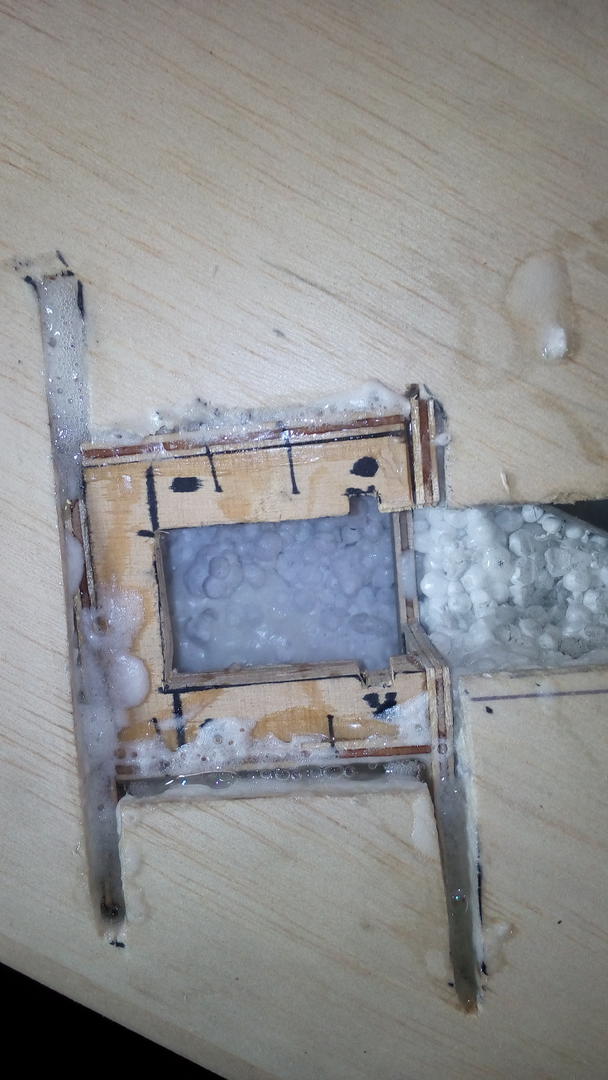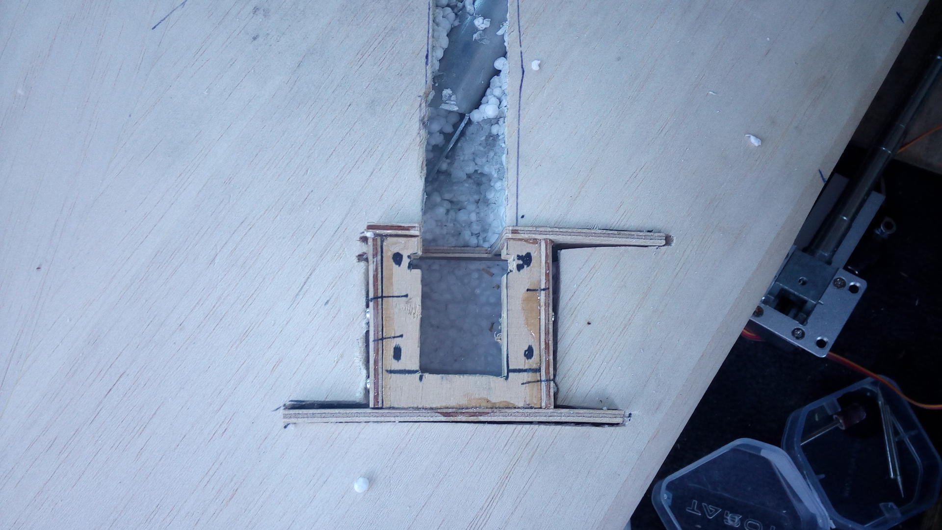 Laget 2 bokser for understellet. De skal forsterkes med 3kant lister på innsiden og tett bunn. Tenkte å bruke vinkelsliper med tynn skive for å skjære opp sporene til finerplatene som skal gå litt fremover og bakover i vingen. Da vil jeg få ett reint fint kutt i isoporen og lettere å få en solid liming.