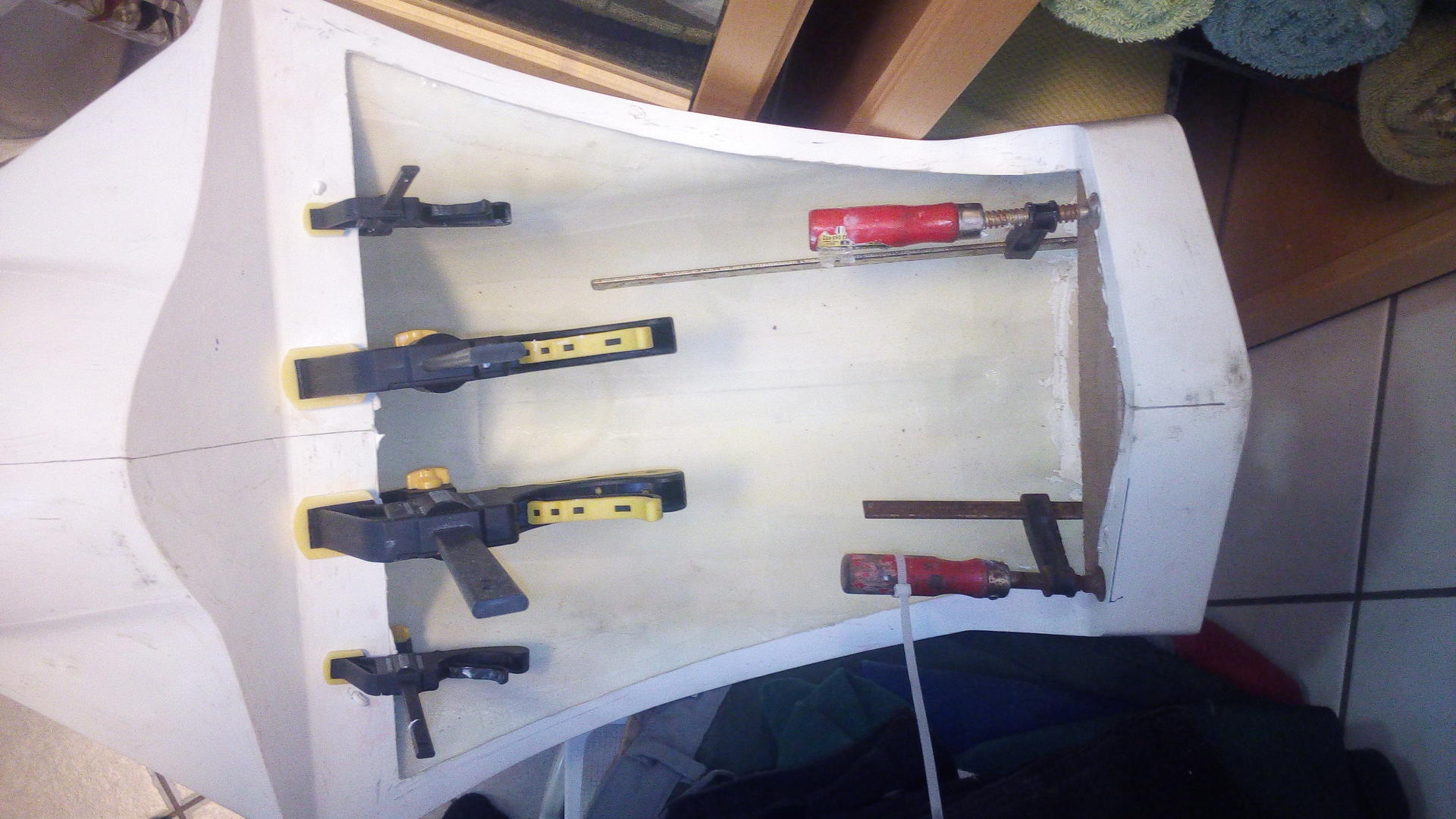 Den ble limt i går kveld. Brukte en sparkel og dro ut tec7 i ett tynt lag på både firewall og glassfiber. for å være sikker på å ikke få noen luftbobler. satte på 5 tvinger på forskjellige steder og stått inne på varmt bad til i dag. ser ut til att det sitter godt