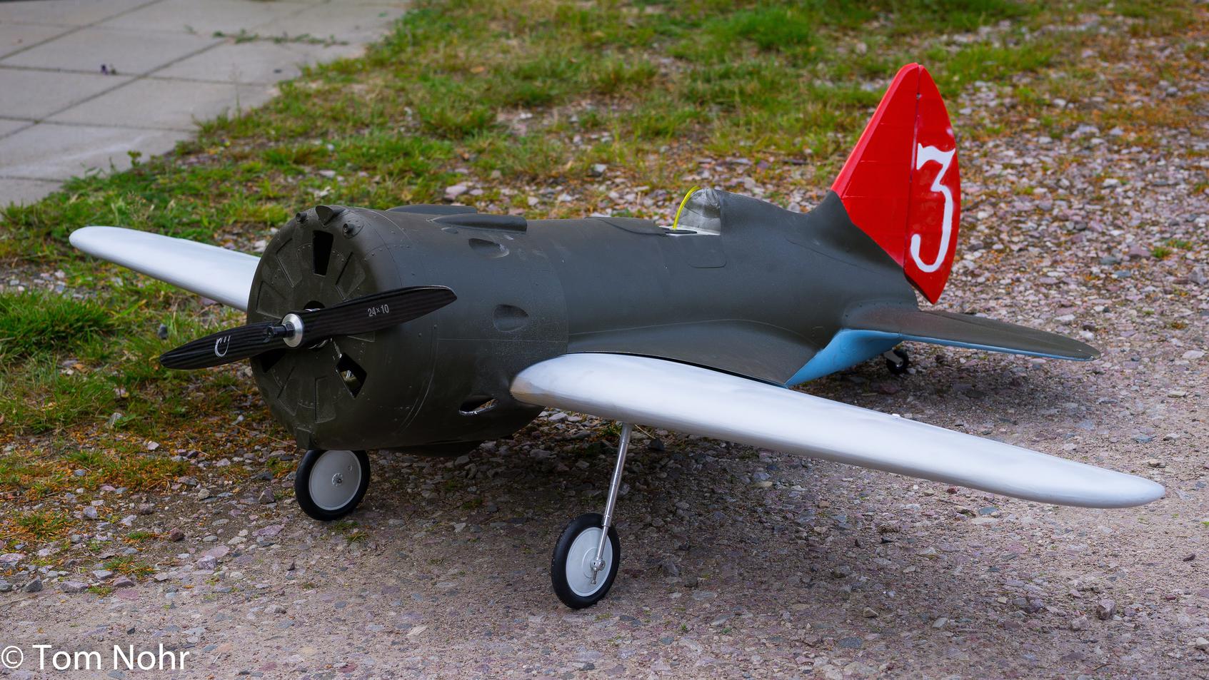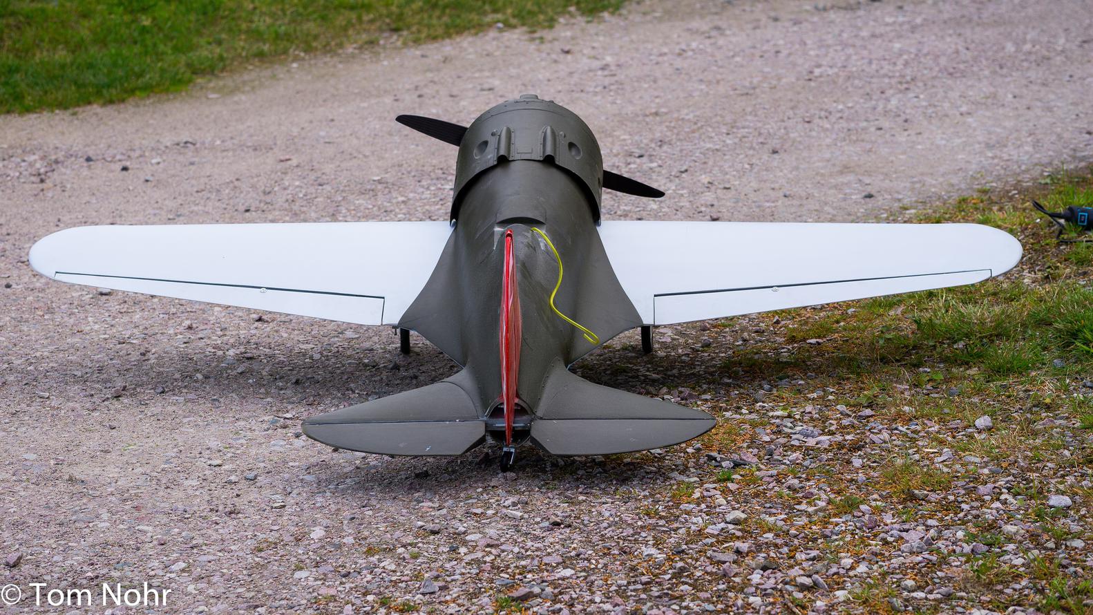 Da har den flydd. Takset litt rundt på stripa først og alt virket ok. og den var lett å styre på bakken. Snudde den mot vinden og ga gass den tok av etter ganska lang stripe. tok av fint og behagelig helt kontrolert. i første svingen så datt ene hjulet av. en mutter som hadde skrudd seg opp. Slo da inn understellet og fløy noen runder og trimmet den inn. 0 knepp på ballanseror men måtte trimme veldig ned på høyderoret for den vill oppover hele tiden. Etter noen runder og forsøk på innflygninger så var det på tide å prøve å få den hel ned igjen. Satset da på å få en buklanding med avslått motor. Kom inn over stripa på lavt turtall og når den var 2 meter over stripa så kuttet jeg motoren. men når den var omtrent 1 meter over stripa så flikket den og slo hjul i sanda uttafor stripa. Ble heldigvis ikke så mye skade. Kroppen gikk opp i en støpeskjøt midt under også fikk den en sprekk på ene siden mellom vinge og stab. Det kan lett repareres med duk og epoxy på innsiden. Ble desverre ikke noen film men tror det var en som tok noen bilder fra lufta. Den er nok litt baktung så derfor jeg måtte trimme så mye på høyderoret og kanskje den ikke hadde flikket så lett hvis tyngdepunktet hadde vært lengre frem?