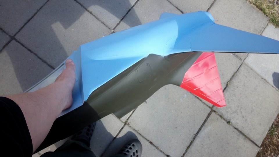 Vinge trekt. Grunnet med 4 strøk. Limt inn fester til servo lokkene og hengslet rorene. Mangler bare tillpassing av støtstenger så er vingen klar for maiden. Fikk 3cm opp og 2cm ned på ballanserorene, det burde vel holde. Er jo ingen 3D kjærre hehe.