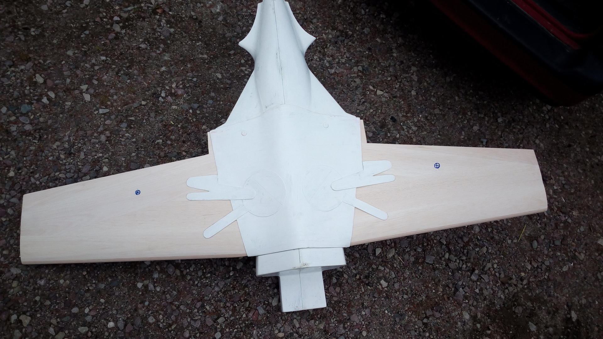 Har tillpasset vingen til kroppen. Neste blir å skjære ut hjullukene fra dekslet som skal sitte under vingenog beginne å tenke på hvordan understellet skal løses. Blir å bruke elektrisk understell. Hadde sikkert vært enklere å lagt inn til ledninger til understellet før jeg limte sammen vingen,men var så vanskelig å få målt ut nøyaktig hvor understellet havner.