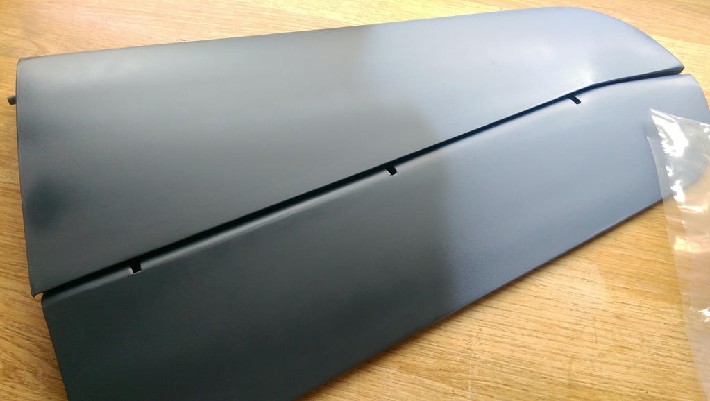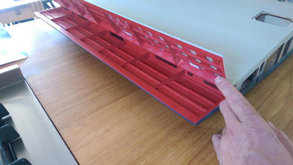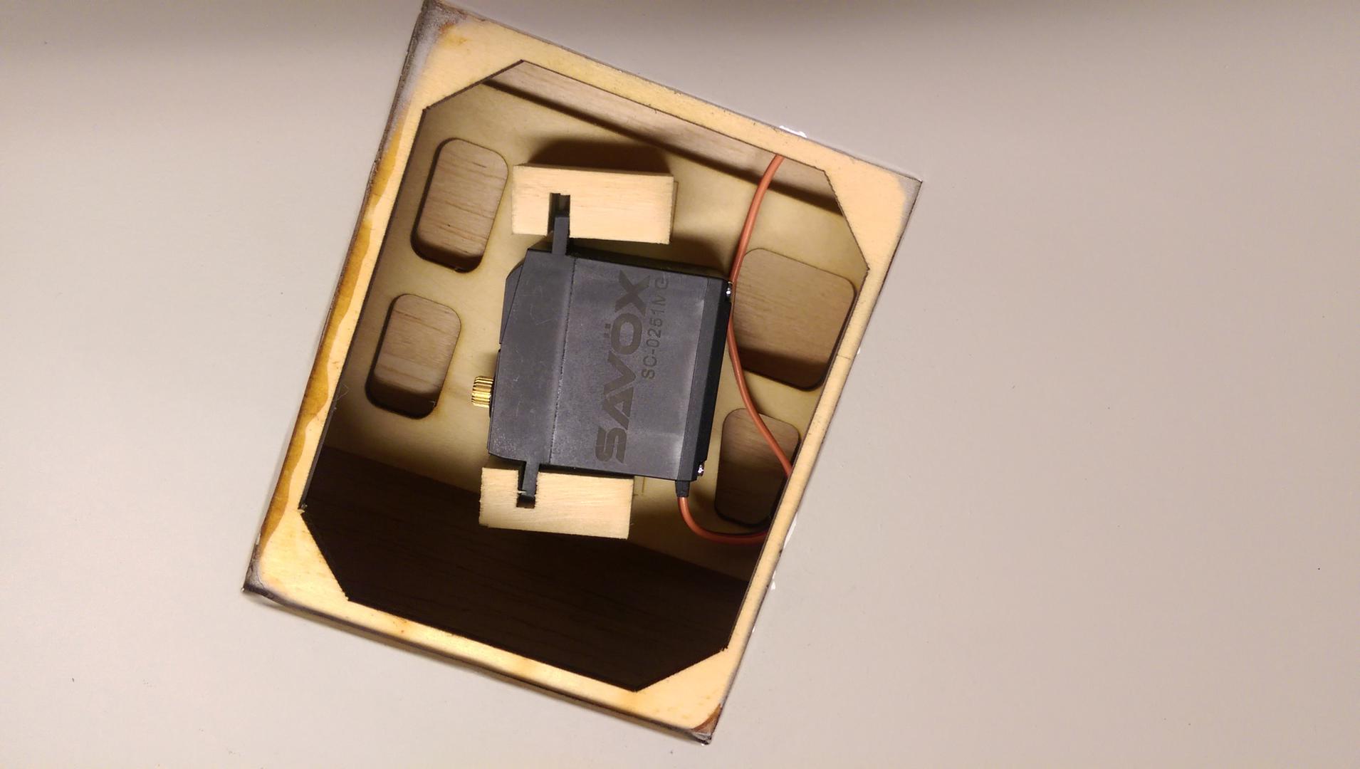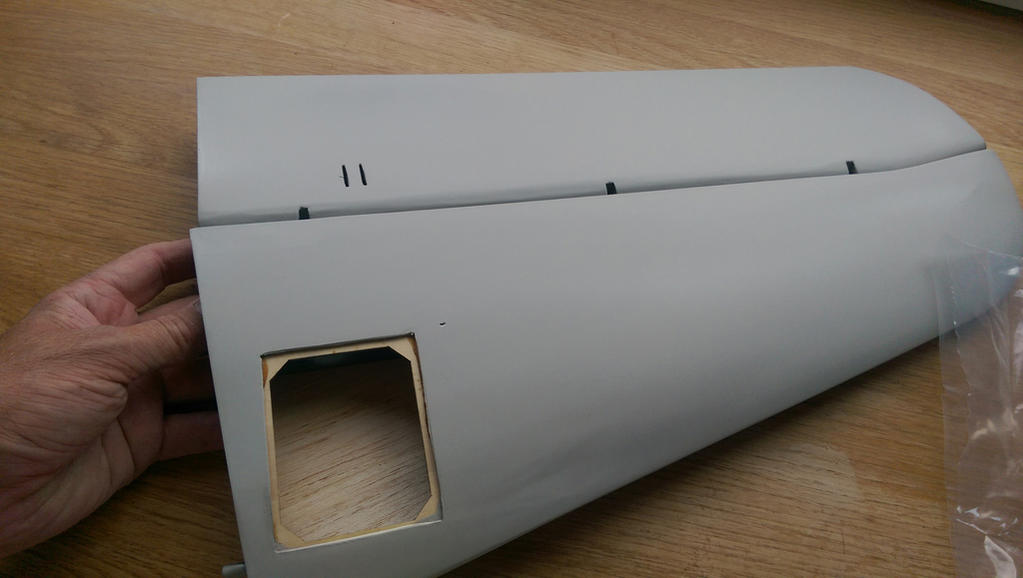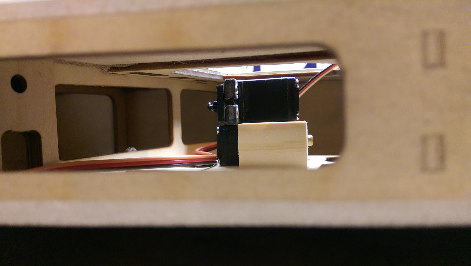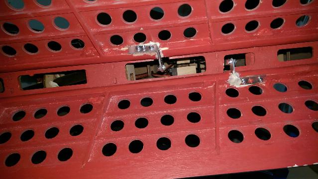 Sånn jeg har forstått og googlet speedbrake/dive og flapssystemet så lander og tar man av med undre flaps, både på vinger og under senterseksjonen (manualen sier at man kun skal bruke senterflap...). Og under dive kombinerer man tre undre flaps med 2 dive brakes oppå vingen. Modellen er laget slik at man egentlig skal linke øvre og undre "flap" på vingene men jeg lager det med to servoer slik at det blir som originalen. Den ene servoen festes med to klosser som limes inn i vingen mens den andre lager jeg et feste til i selve lokket. Limer på en plate for stivhet og bruker treklosser som servoen skrus i. Tok noen bilder men blir lettere å se etterhvert.