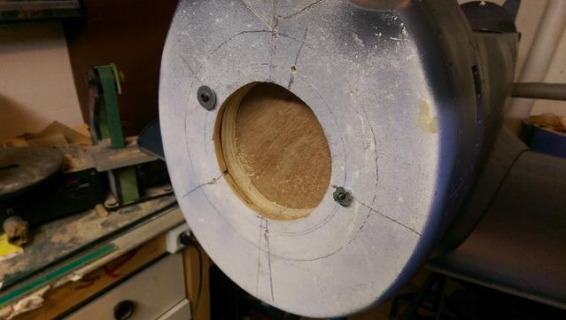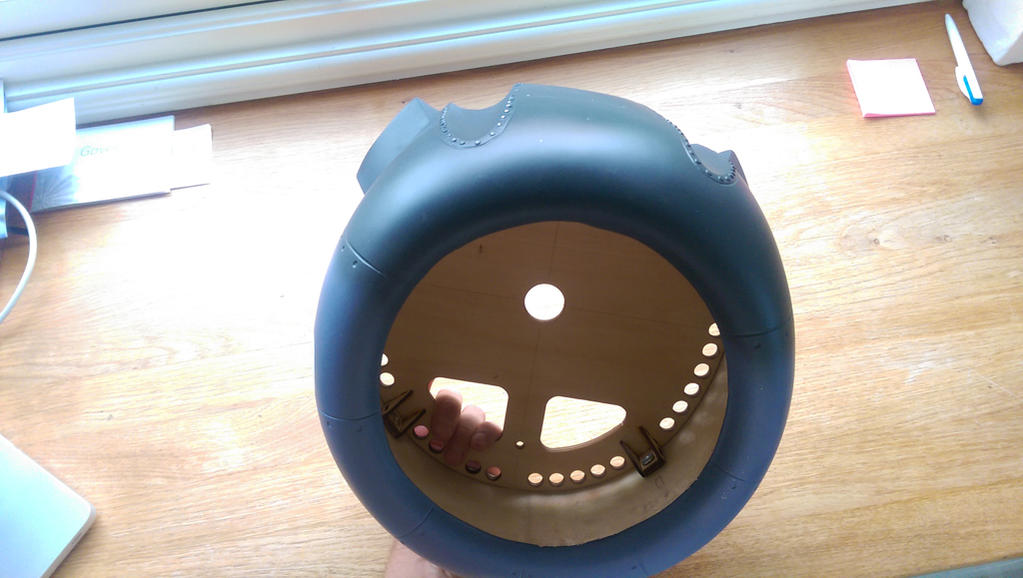 Motor og innfelt firewall på plass. Cowlingen er tenkt montert helt inntil kroppen men originalen har åpning rundt hele til kjøling og det trenger nok jeg også...