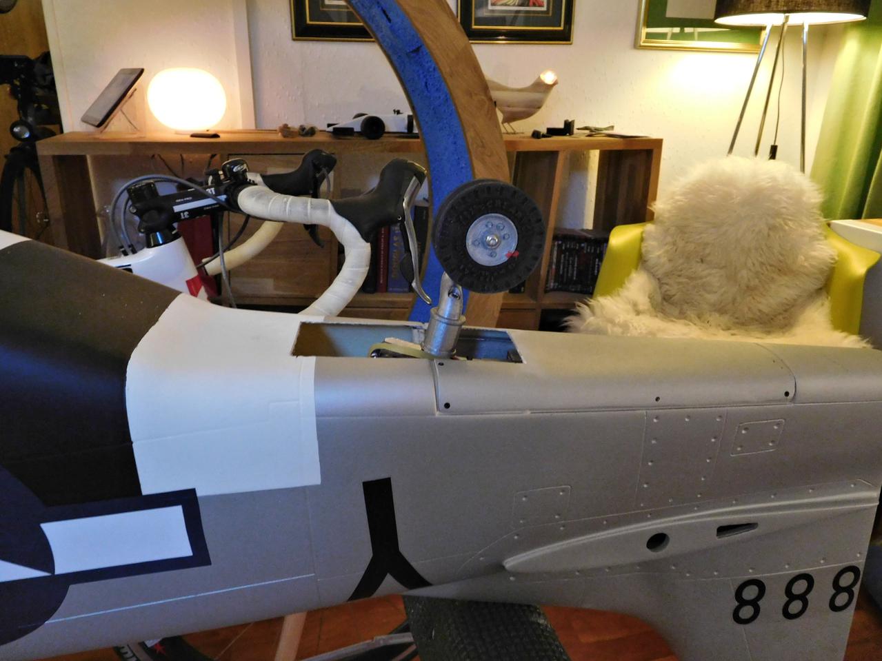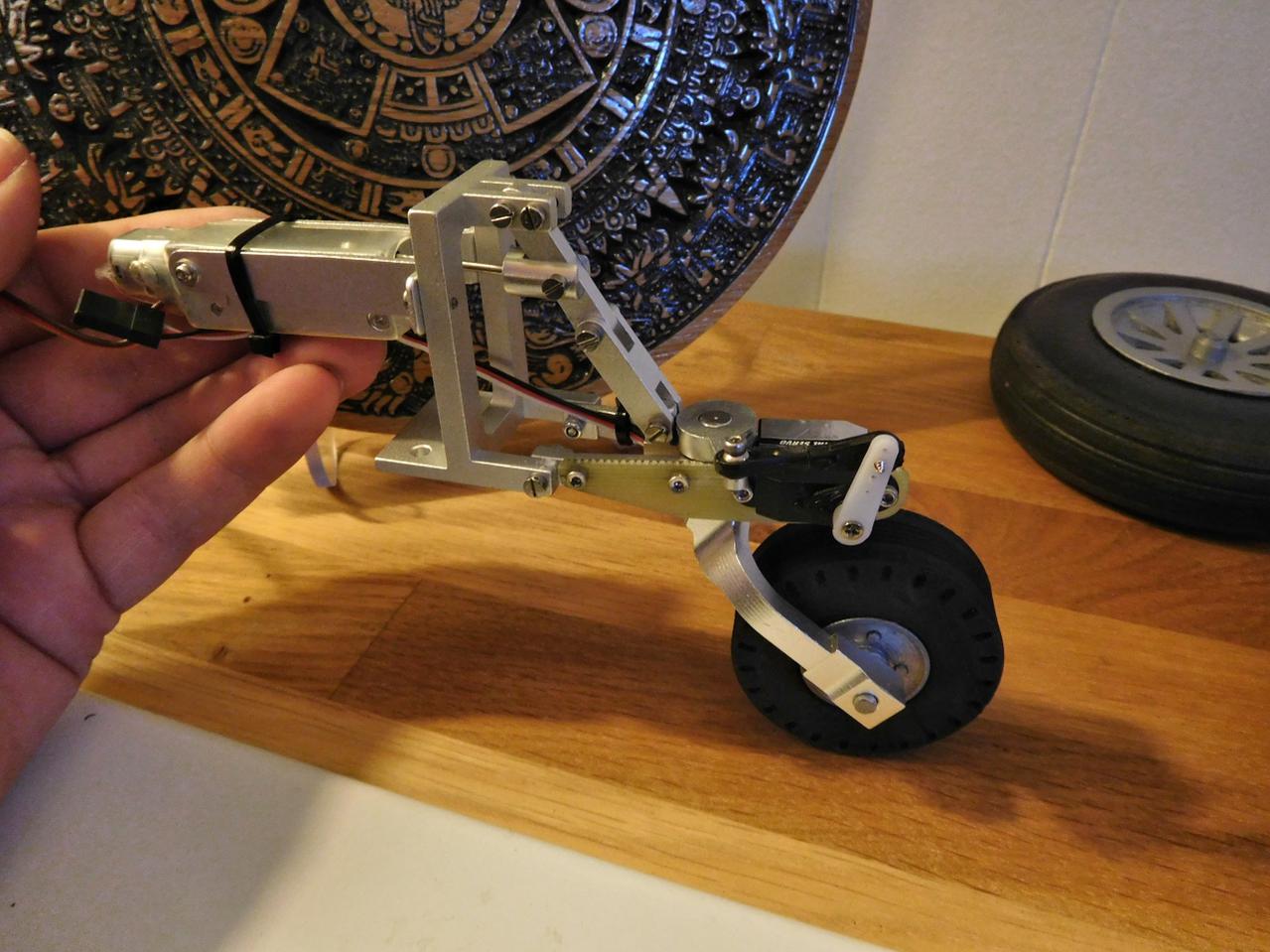 Fikk ikke sove i natt så jeg sto opp og monterte halehjulet. Jeg tror hjulet ender opp ca 10 mm for langt bak, men det får være. Syns det ser ok ut. Jeg måtte øke bevegelseslengden til retract-enheten ved å lage en ny link, men nå går den opp fremover.