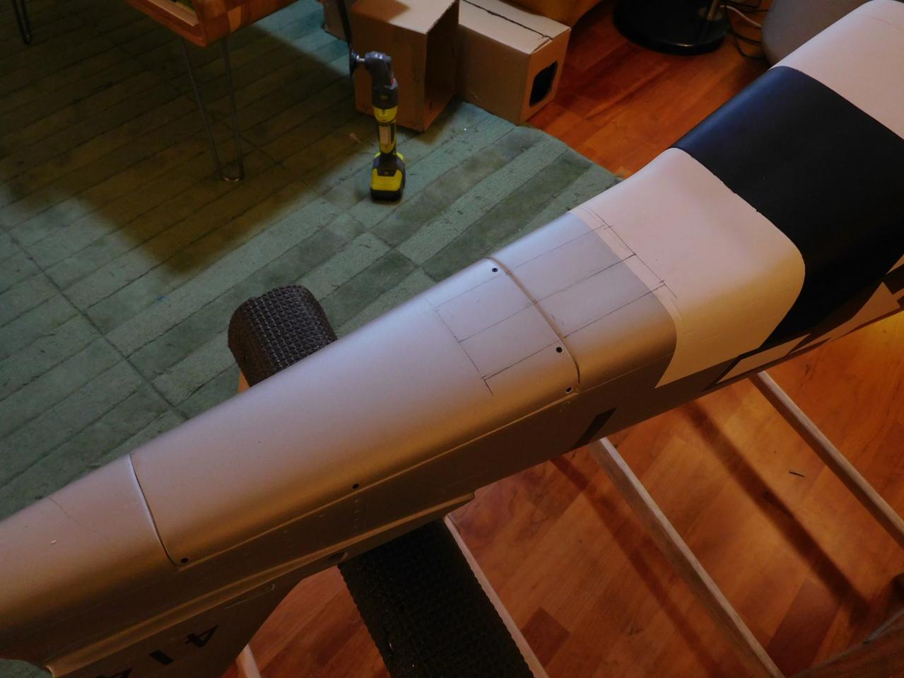 ESM lager fine fly, men de har alltid noen rare ting ved seg. Her har jeg tegnet omrisset til halehjuldørene slik de skal være for å være skalariktige, og dere ser jo hvor ESM har valgt å plassere luka. Jeg har målt på nedskalerte tegninger for å treffe. Det er heldigvis ganske så flate hjuldører her så det er ikke noe problem i praksis. OM man velger å bruke det faste halehjulet som følger med så havner hjulet på nesten riktig plass, men med opptrekkbart så må man kutte i stykker hele det tykke spantet inni der.