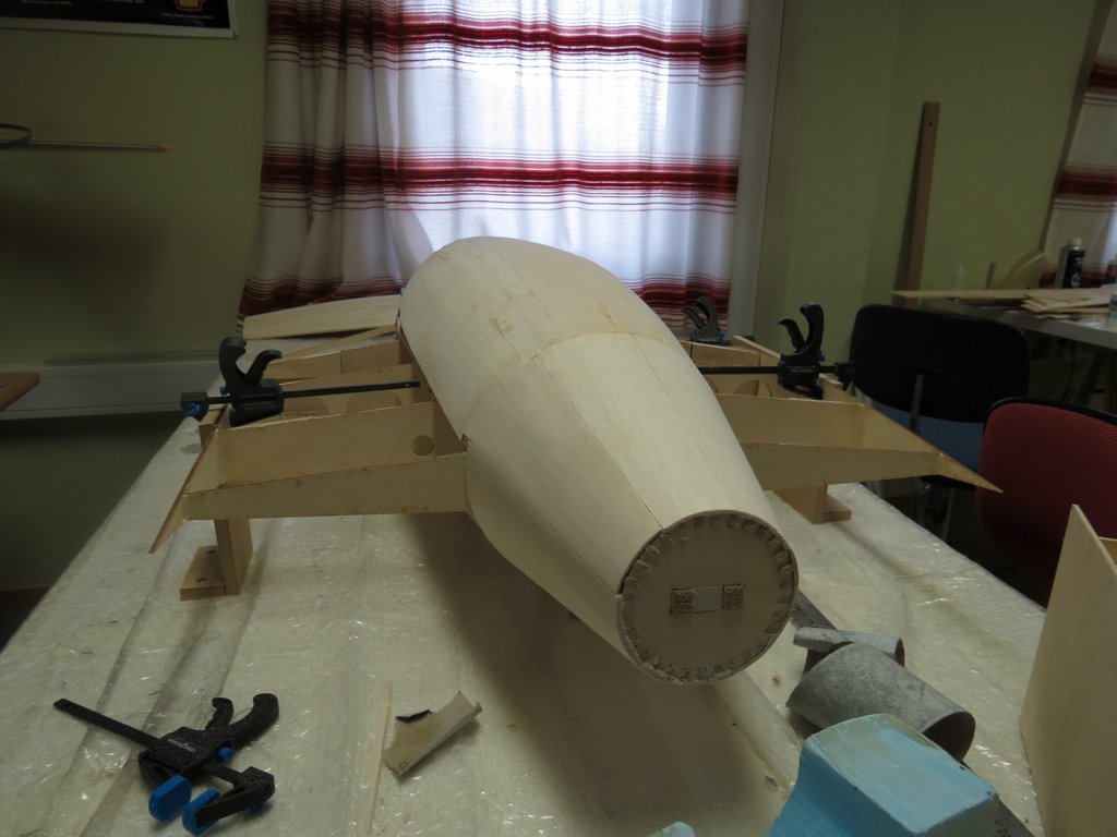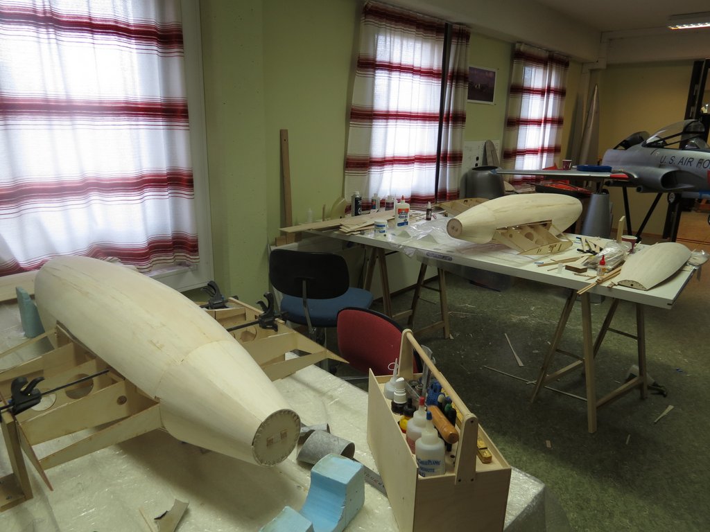 Vært mye dritt arbeid nå. Sheeting av dobbelt krumma kropp er jo ikke akkurat drømmejobben. Denne kroppen har ganske skarpe svinger så jeg må innrømme at jeg har snakket en del nordnorsk i dag. Jeg er vel unnskyldt da jeg er født i Tromsø selv min nordnorsk karriere var kort så ser den ut til å fungere som stress release under bygging. Vi har i hvertfall to stykk balsa trukket Vampires nåYess. Har og bygget horisontal stab. Nå er det pussejobb, etterbestilling av treverk samt at vi nok satser på 3 modellering, cnc fresing av plugg og støping av glassfiber nese og halestubb.