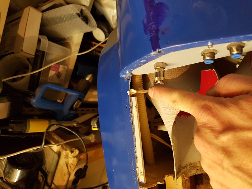 Den er lakket/malt i etterkant av støp. Det er laget en åpning i lakken ved siden av gjennomføringen som var meningen å bruke for sjekk av fuelnivå etter hver tur.