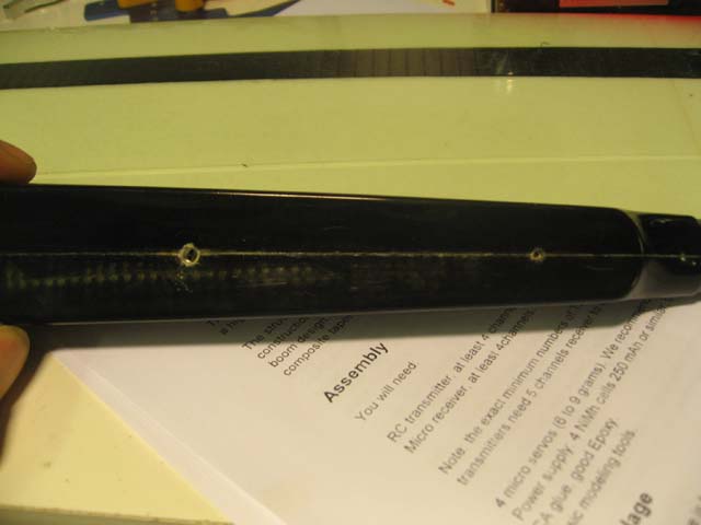 Pass på at vingen sitter rett på kroppen før du gjør dette - fest et tau helt bakerst på bommen (ved halefinnen) og mål ut til vinge tippene, når begge avstandene er like lange så kan du bore et bakerste hullet.