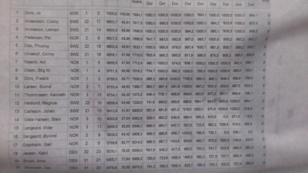 Det ble ett flott mesterskap og jeg tror alle var meget fornøyd. Selv Danskene som ikke hadde hellet med seg denne gang var fornøyd. Vi holdt på leeeeenge lørdagen, men fikk da også inn 8 omganger. Legger ved noen resultater og noen bilder.