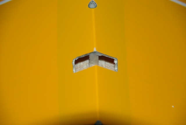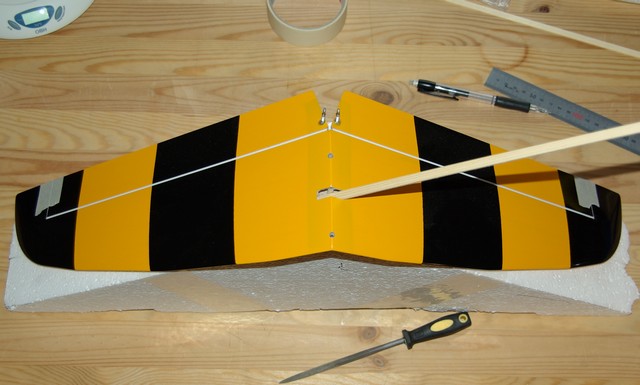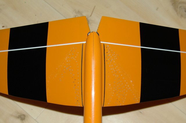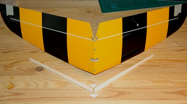 Har vært mye plaget med at V-halen på RaceM'n min ikke har tålt harde landinger. Ikke nødvendigvis så harde heller, men slik at halen dasker litt hardt nedi. La inn en 10 x 2 mm furulist i underskinnet, i håp om at det skulle være tilstrekkelig, men det var ikke nok. Har reparert den noen ganger nå.
