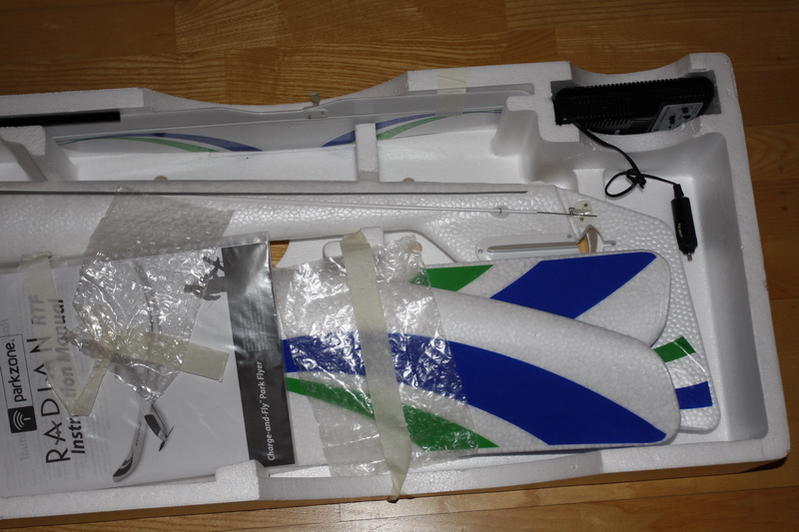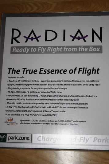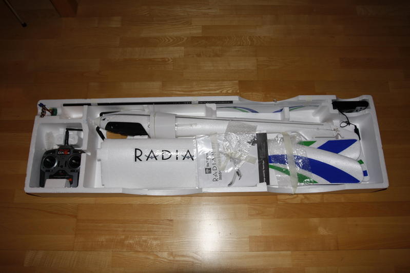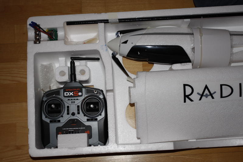 Radioen som følger med er en 5 kanals Spektrum med full rekkevidde og noen enkle funksjoner som trainerutgang, reversering og elevon/delta mixing og dualrate.