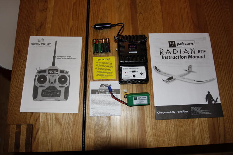Spektrum DX5e, parkzone 3S1300 mah batteri, servoer, 30A ESC og børsteløs motor sitte r montert og alt er klargjort. I tillegg følger det med lader som trenger 12V strømkilde.