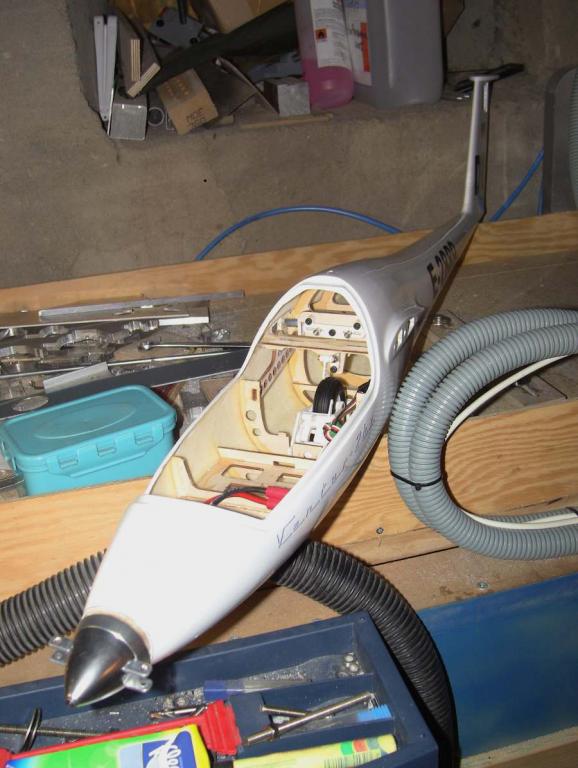 Jeg prøver denne motoren. Har frest ut den fremste delen av innredningen der slepeutløser og tilhørende servo skulle sittet for å få plass til motor og batteri. Det blir ikke mye plass, men skal få til et 4S 1300mah lipo. Håper det ihvertfall skal gi et godt opptrekk pr utladning. Det hadde ikke vært plass til mere strøm i DF-poden heller og jeg vil tro at propell er mer effektivt, men det blir nok ingen rakett...