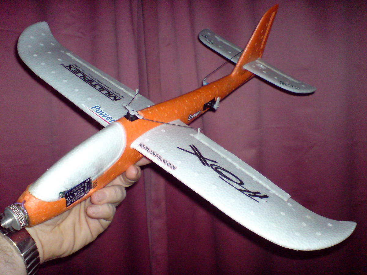 Hadde en CD spiller som ikke var helt god så jeg tok ut motoren som er børsteløs med snert i som ble limt fast i snuta ,den har litt høyretrekk/nedtrekk ,så har jeg koplet den til en Hyporion 20 amp regulator. Alt er balansert til CG 1/3 ifra forkant av vingen, batteriet skal være FlightPower på 400 mah 3S ...nå veier det 154 gr uten propp.