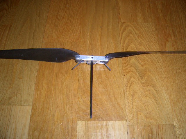 Som du har observert så ligger disse klapp propellene akkkurat i samme bane uansett turtall. Selv store propeller som 17x11 oppfører seg akkurat likt. I alle fall propeller som Graupner Cam, Aeronaut etc. Når det gjelder posisjon under glideflukt når den brukes som pusher er det som nevnt viktig at de ikke klapper for mye sammen fordi de da ikke nødvendigvis slår seg ut igjen riktig. Som jeg nevnte så fikset jeg dette enkelt med en streng for å hindre dette. Spinner trengs ikke. Jeg har tatt et par bilder av en propell jeg laget for å vise.
